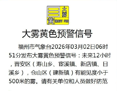 福州市气象台今日06时51分发布大雾黄色预警信号,未来12小时,晋安区(寿山乡、宦溪镇、新店镇、日溪乡)仓山区(建新镇)有能见度小于500米的雾。