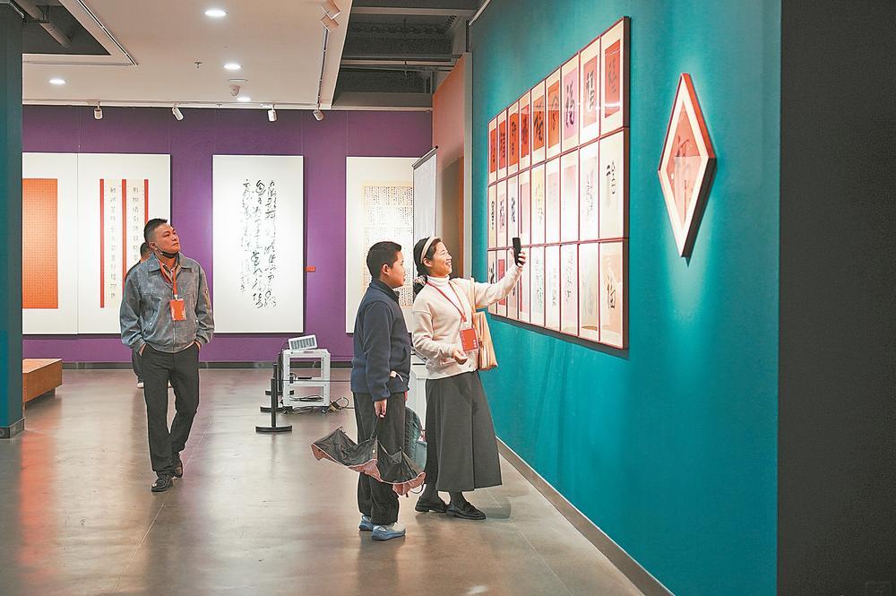 据了解,本次展览由福建省炎黄文化研究会、福文化研究院、省书法家协会和福州市文旅局共同主办。图为参观者在拍摄展品。(通讯员 叶青 记者 张文奎 摄影报道)