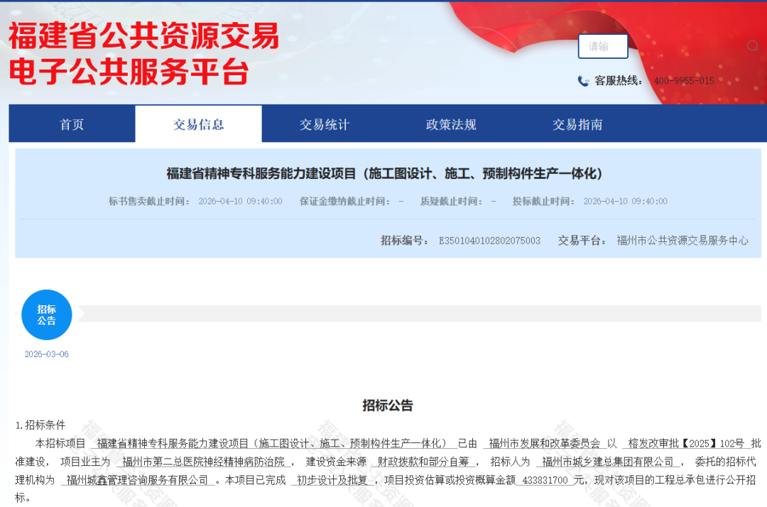 2026年3月6日,福州市公共资源交易服务中心发布“福建省精神专科服务能力建设项目(施工图设计、施工、预制构件生产一体化)”。