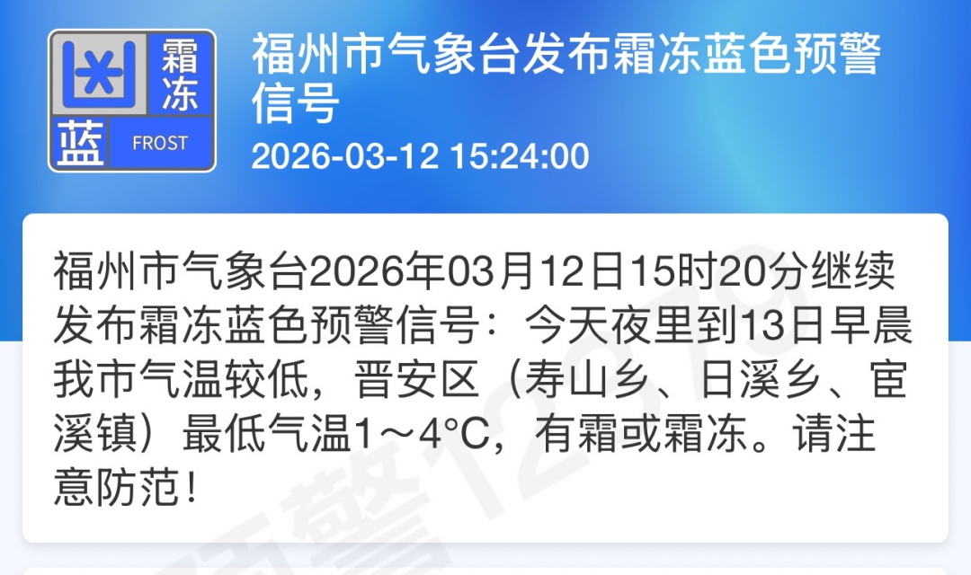 虽然天气晴好,但冷空气的实力依旧不容小觑,3月12日15时20分,福州市气象台发布霜冻蓝色预警信号:12日夜里到13日早晨,福州气温较低,晋安区(寿山乡、日溪乡、宦溪镇)最低气温1~4°C,有霜或霜冻。请注意防范!