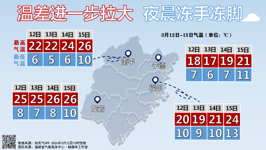 12日至14日,福州内陆和沿海北部城区最低气温4~7℃,高海拔山区最低气温0~3℃,市区和南部沿海城区最低气温7~10℃,请注意根据气温的变化,适时增减衣物,谨防感冒。