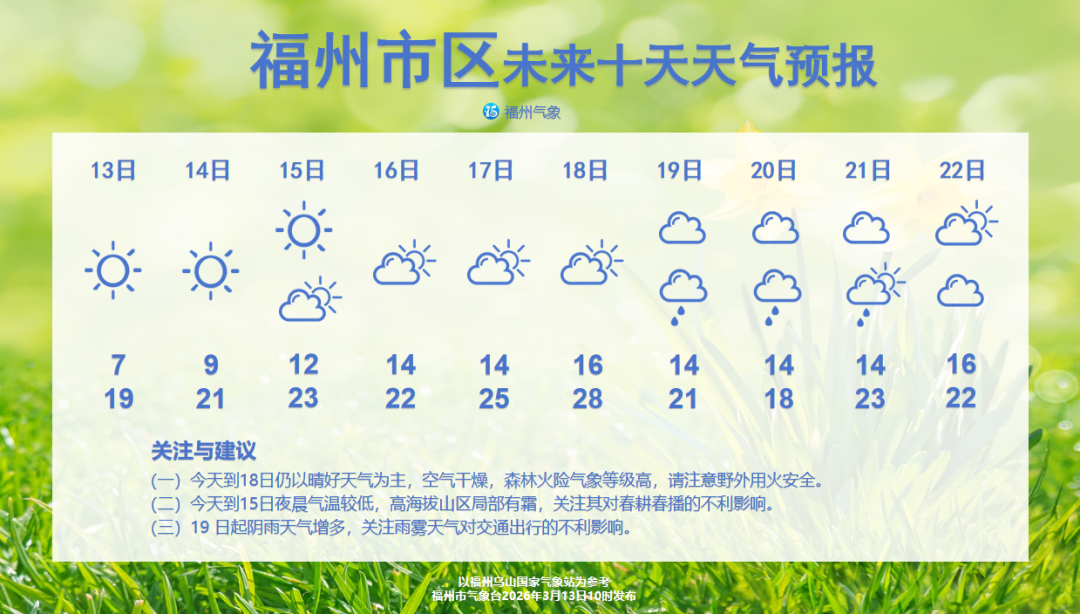 (一)13日到18日仍以晴好天气为主,空气干燥,森林火险气象等级高,请注意野外用火安全。