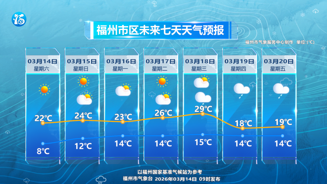 14日起福州的气温将会进一步升高,下周三最高气温直逼30℃,白天有阳光的加持,体感温暖舒适。最低气温虽然也相应升高,但昼夜温差大,请注意根据气温的变化,适时增减衣物,谨防感冒。