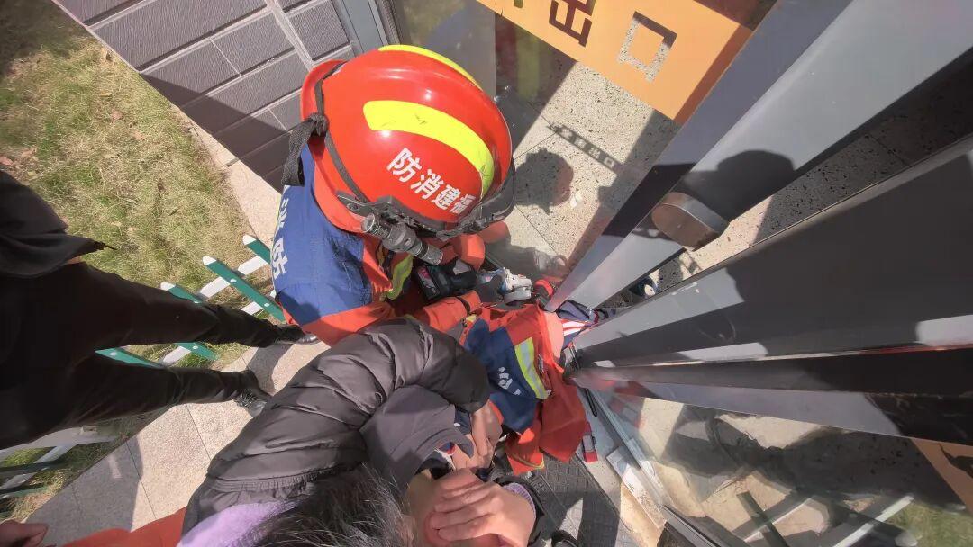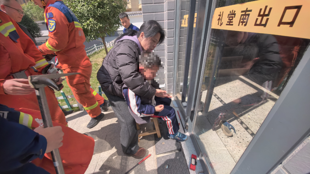 消防救援人员抵达现场后发现,一名9岁左右的小学生左小腿被卡在学校礼堂大门的门缝中。根据现场情况,救援人员一边安抚男孩情绪,一边使用角磨机锯断门框上的U形锁扣。经过约5分钟紧张救援,男孩成功脱困。