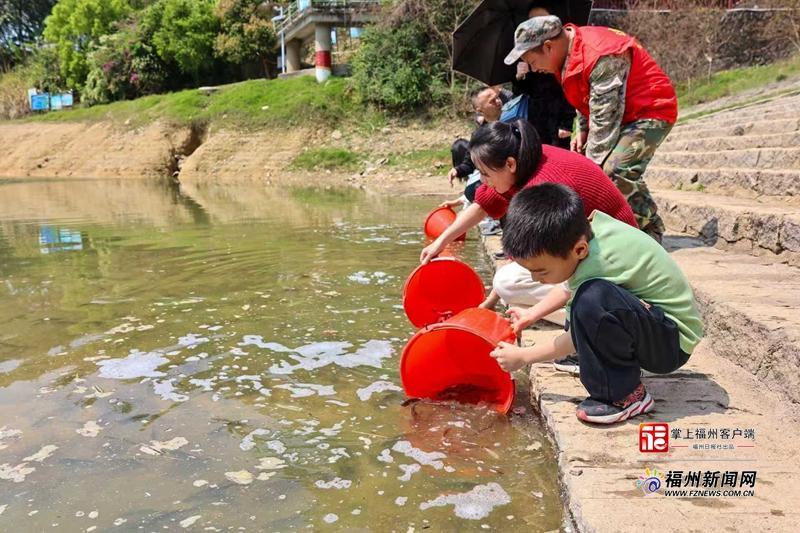 志愿者投放鱼苗。(连江融媒体中心供图)