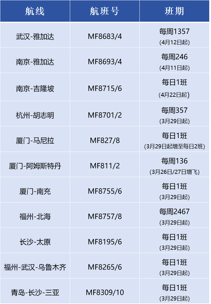 国际航线方面,厦航进一步加密重点国际航线,厦门—阿姆斯特丹增至每周三班,分别在周一、周三、周六执飞,厦门—马尼拉增至每日两班。