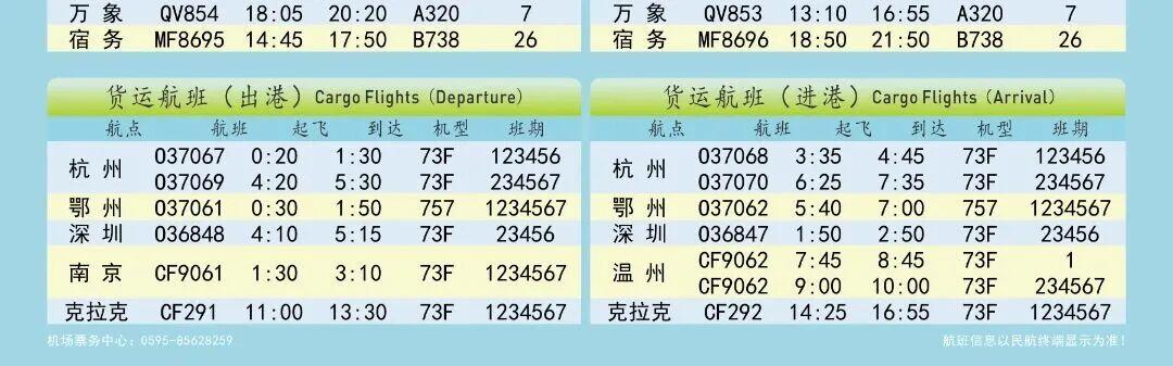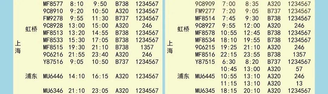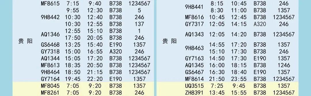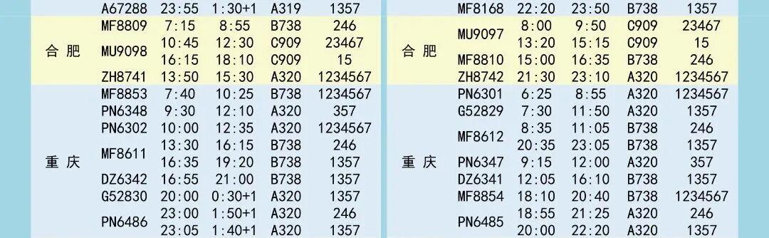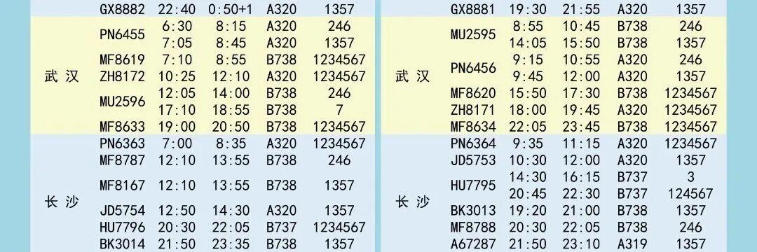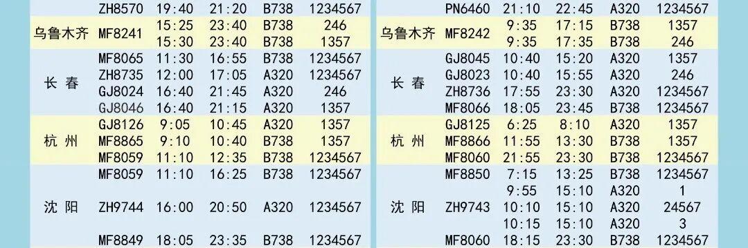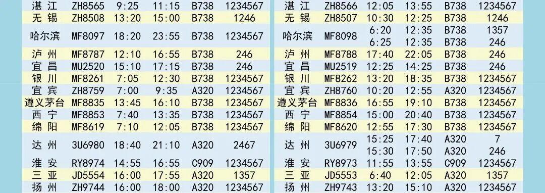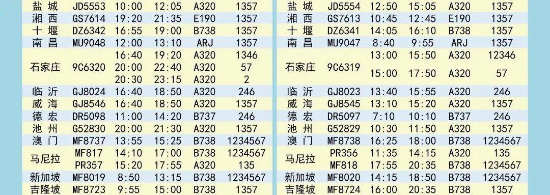 夏航季航班时刻表如下↓