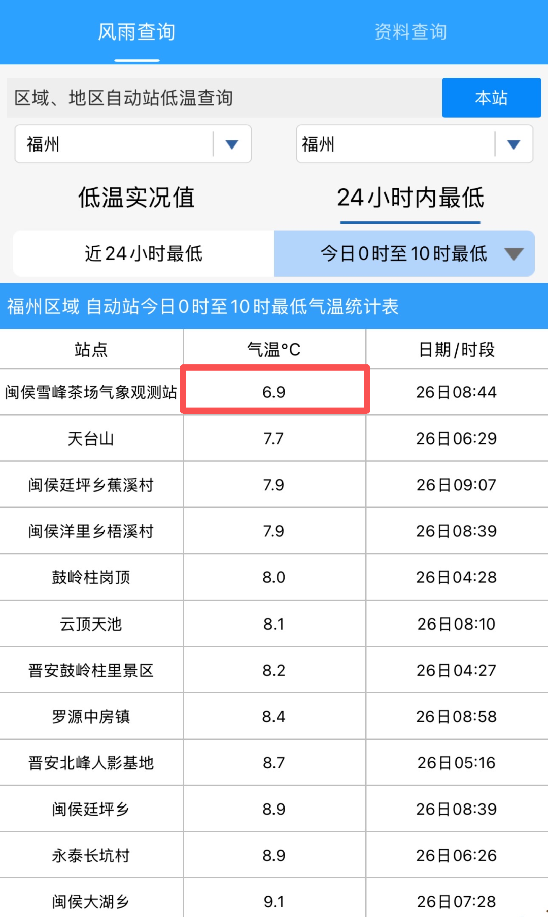 据“知天气”App统计,26日,福州多个站点最低气温跌破10℃。其中,闽侯雪峰茶场气象观测站最低温仅有6.9℃。