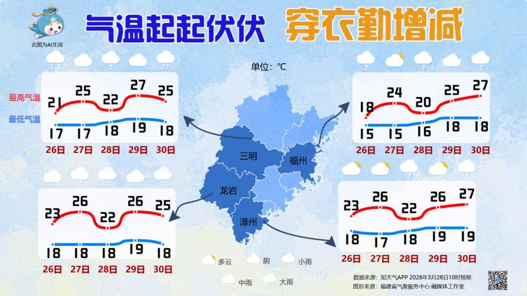 此外,未来几天,福州气温波动频繁。以市区为例,26日最高气温19℃,27日升至24℃左右。周六小幅下降后,又将回升到27℃左右。之后又有冷空气抵达,昼夜温差始终保持在6~10℃之间。早出晚归的朋友,必注意添衣保暖,谨防感冒。