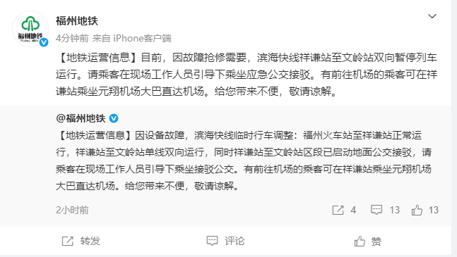【地铁运营信息】目前,因故障抢修需要,滨海快线祥谦站至文岭站双向暂停列车运行。请乘客在现场工作人员引导下乘坐应急公交接驳。有前往机场的乘客可在祥谦站乘坐元翔机场大巴直达机场。给您带来不便,敬请谅解。