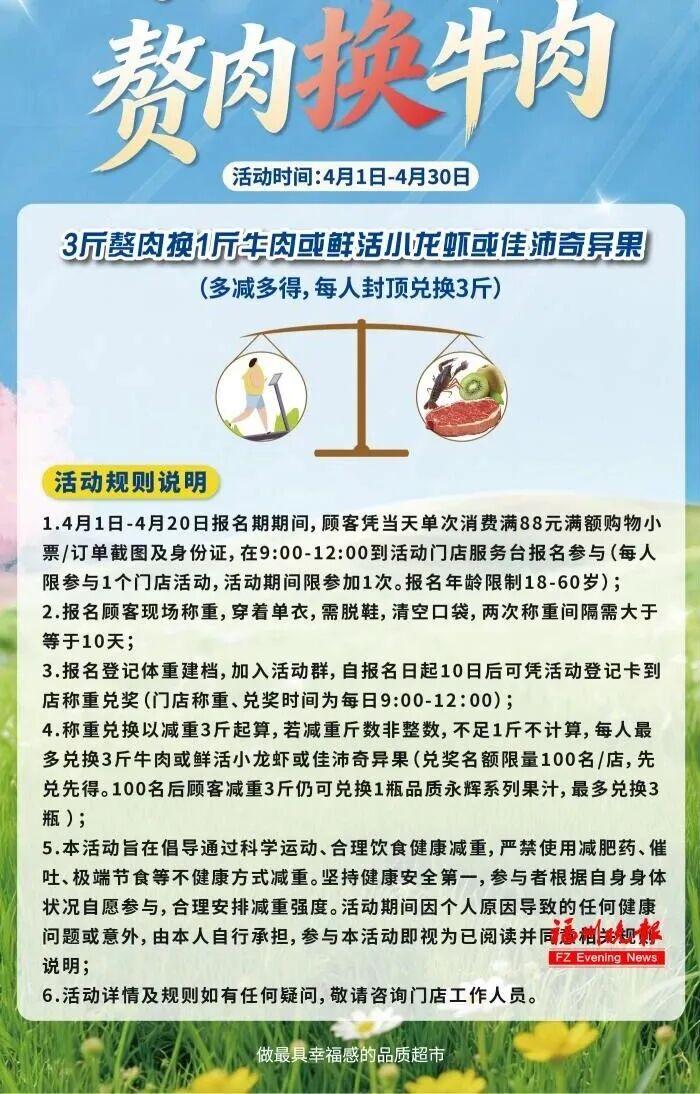 “因为收到网友‘全国推广’的呼声,所以我们将活动拓展,现在全国所有门店都同步上线‘来永辉,赘肉换牛肉’活动,减重3斤即可兑换1斤牛肉、鲜活小龙虾或佳沛奇异果(三选一),每人封顶可兑换3斤。活动期间,顾客凭当日单次消费满88元的购物小票或订单截图,携带身份证前往活动门店服务台即可报名建档,自报名日起10天后可到店称重兑奖。”永辉超市品牌营销部负责人刘少强表示,希望通过趣味互动,让健康管理变得更有获得感和参与感。“我们鼓励市民关注健康生活方式,在科学减重中收获实实在在的快乐。”
