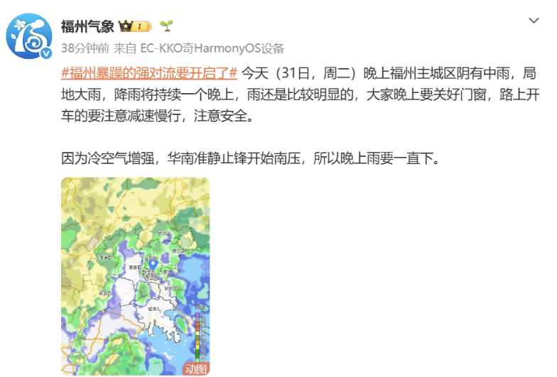 据福州气象微博,今天(31日,周二)晚上福州主城区阴有中雨,局地大雨,降雨将持续一个晚上,气温15℃~16℃。雨还是比较明显的,大家晚上要关好门窗,路上开车的要注意减速慢行,注意安全。