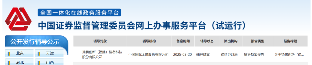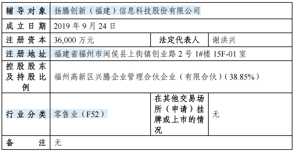 5月21日,证监会IPO辅导公示系统显示,扬腾创新(福建)信息科技股份有限公司(扬腾创新)向福建证监局提交辅导备案报告,辅导机构为中金公司。福州高新区兴腾企业管理合伙企业(有限合伙)为控股股东,持股38.85%。