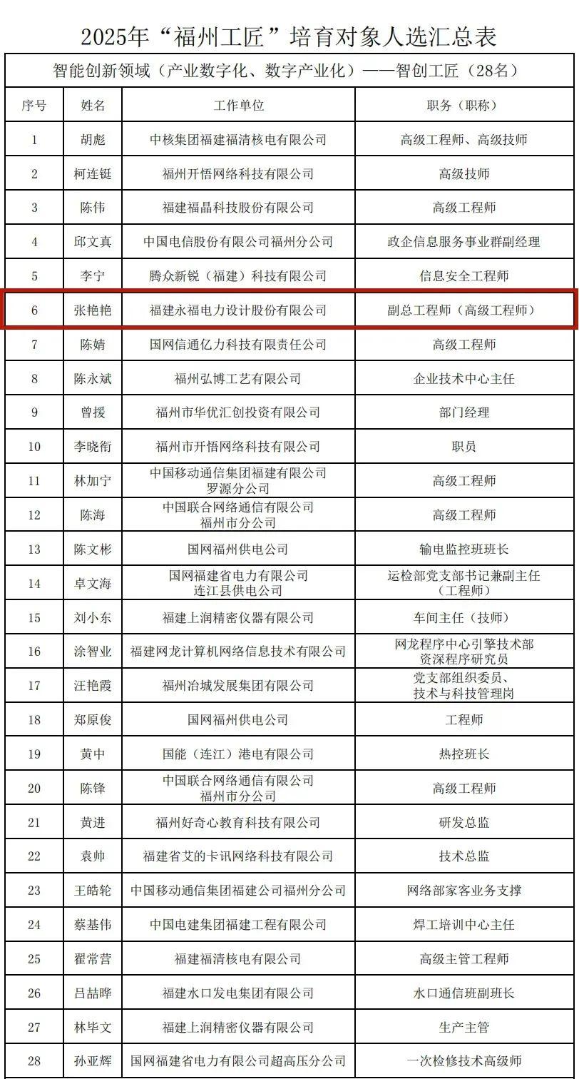 2025年“福州工匠”培育对象人选