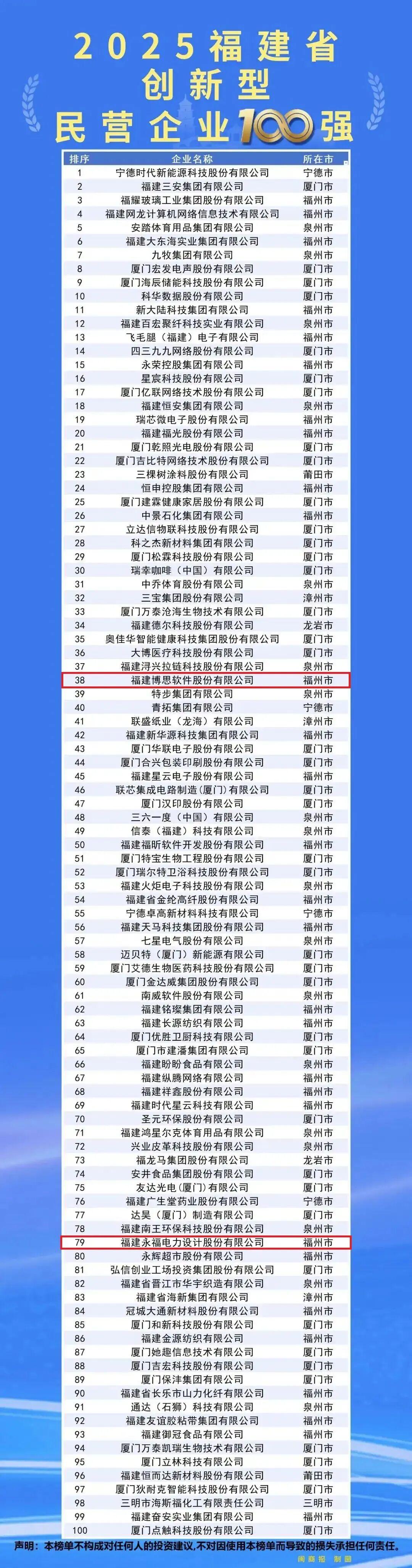 入围“2025福建省创新型民营企业100强”