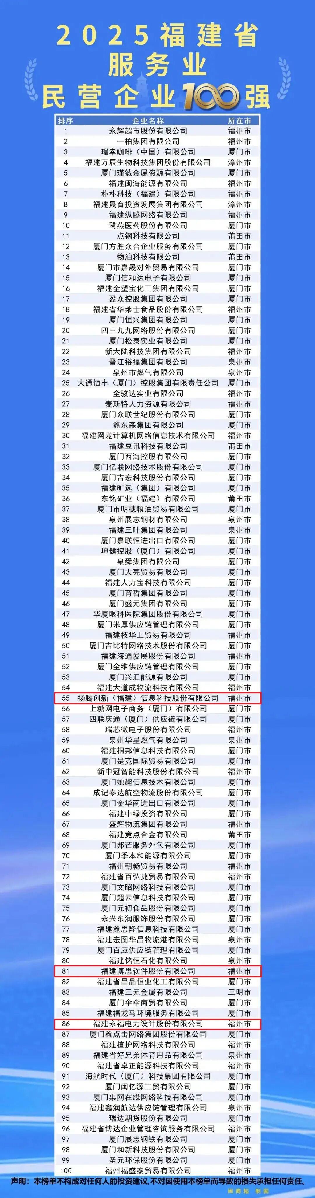 入围“2025福建省服务业民营企业100强”