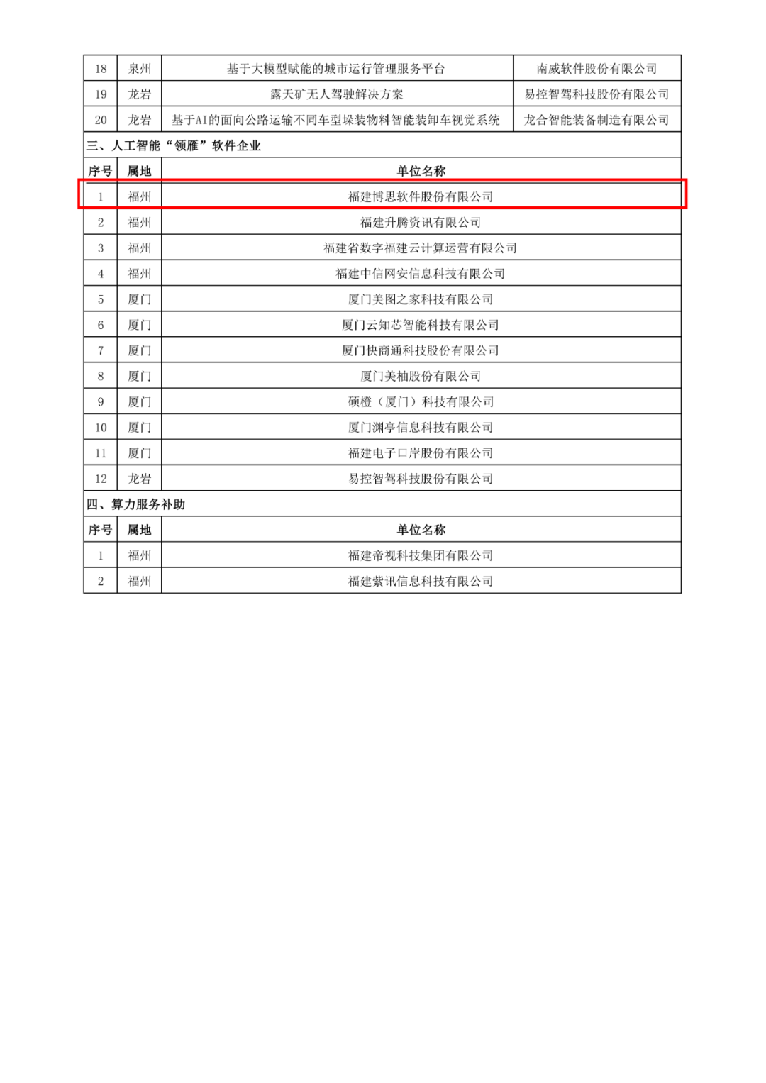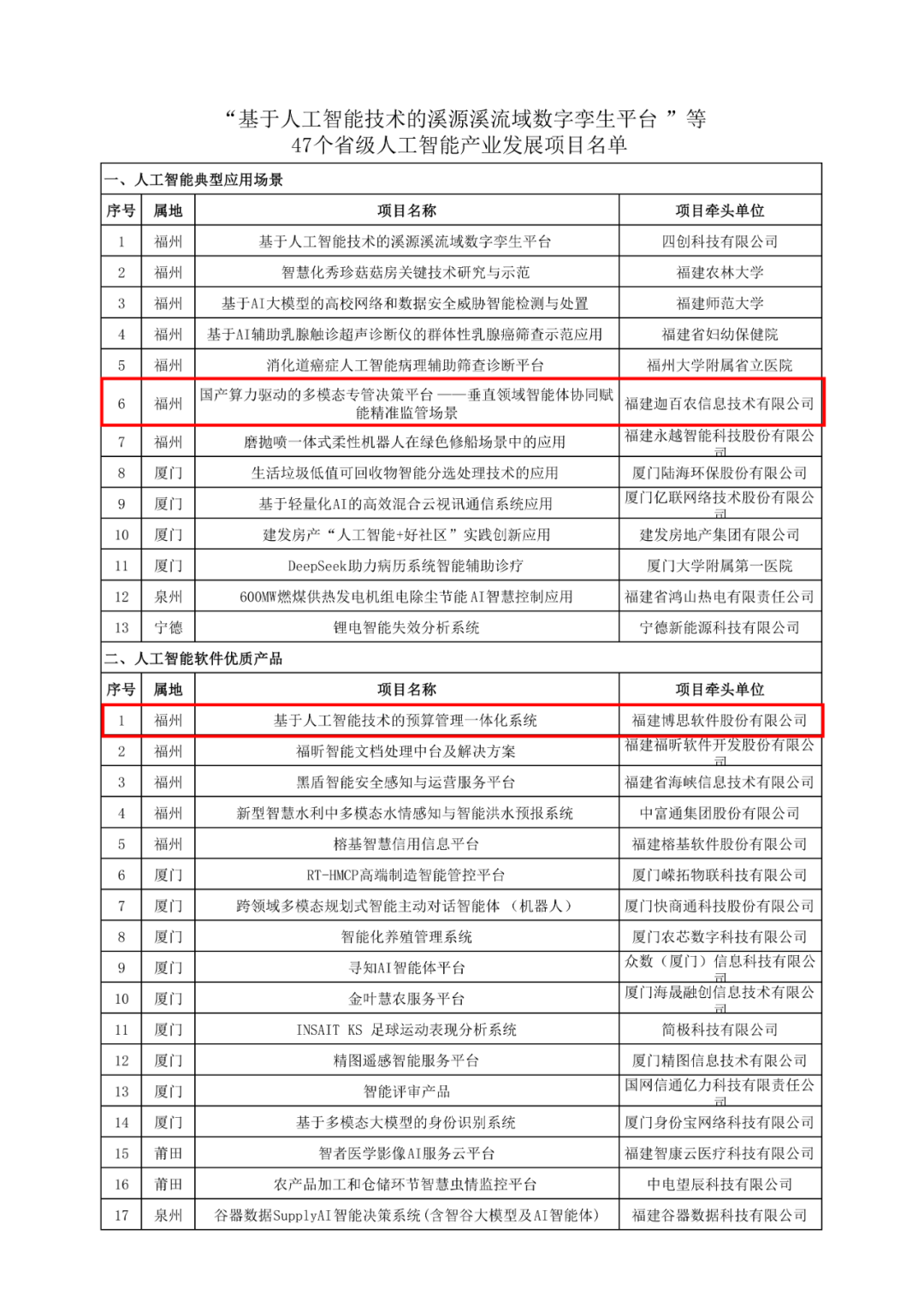 近日,福建省工业和信息化厅正式公布“基于人工智能技术的溪源溪流域数字孪生平台”等47个省级人工智能产业发展项目名单,福州高新区福建博思软件股份有限公司、福建迦百农信息技术有限公司2家企业上榜。