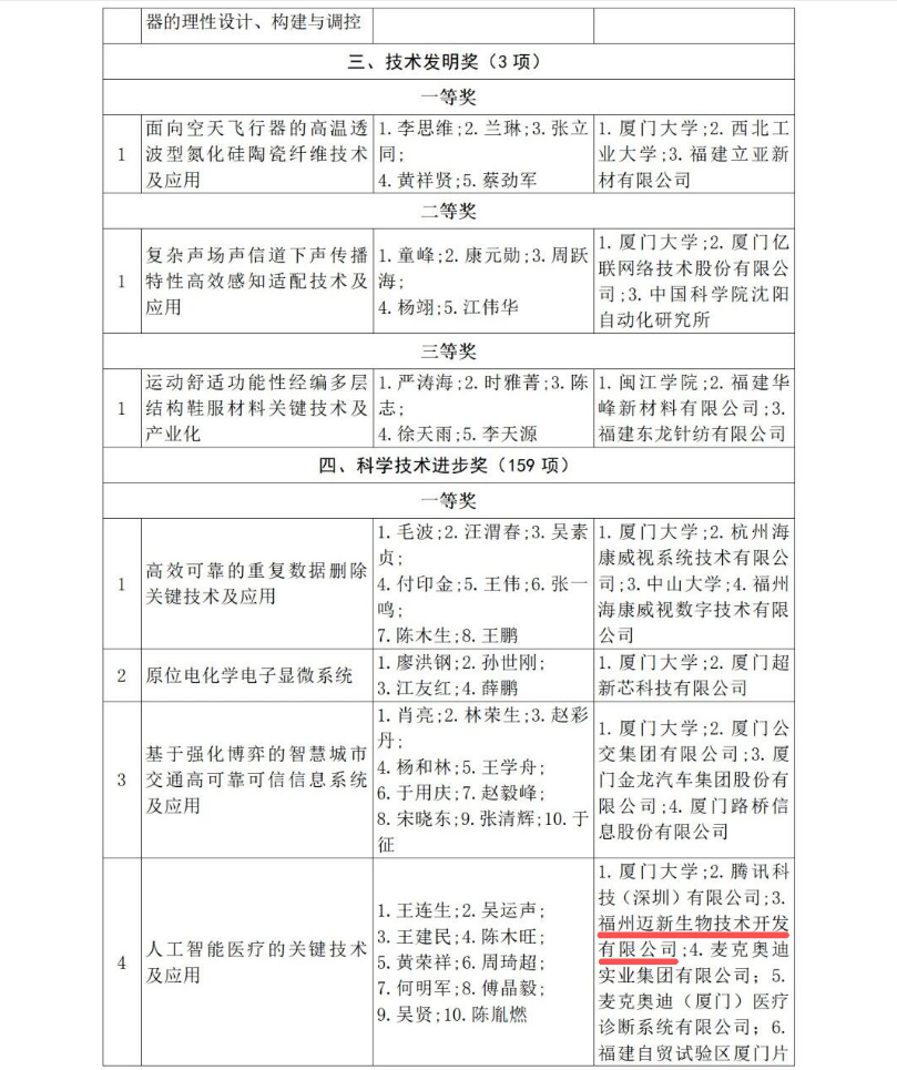 四、授予“高效可靠的重复数据删除关键技术及应用”等25项成果福建省科学技术进步奖一等奖,授予“大功率氢燃料电池重卡研制及产业化”等51项成果福建省科学技术进步奖二等奖,授予“保护性建筑修缮和加固技术创新和工程应用”等83项成果福建省科学技术进步奖三等奖。