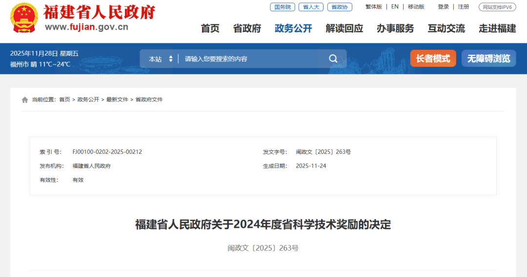 福建省人民政府关于2024年度省科学技术奖励的决定