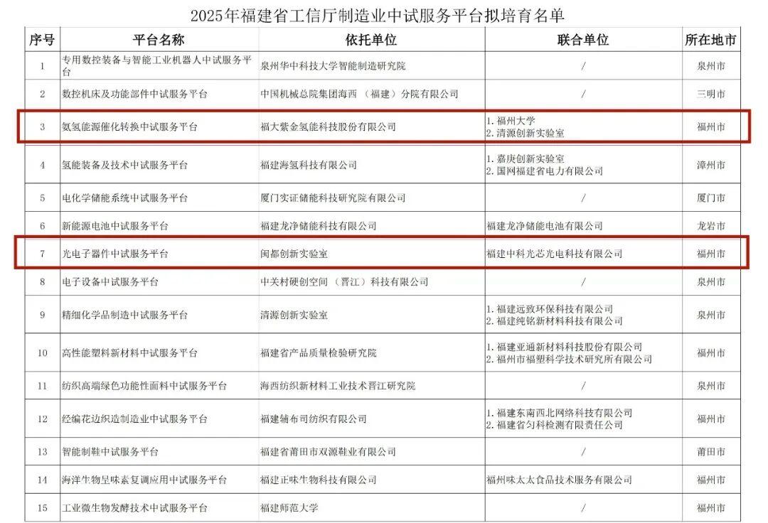 近日,福建省工业和信息化厅公示了2025年福建省工信厅制造业中试服务平台拟认定培育名单。其中,位于福州高新区的福大紫金氢能科技股份有限公司、闽都创新实验室成功入选。