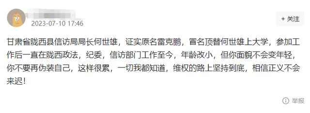 7月10日,有网友在社交平台发文称,定西市陇西县信访局局长何世雄原名雷克鹏,疑似涉嫌冒名顶替他人上大学。“公职人员冒名顶替”这一话题,引起了网友广泛关注。