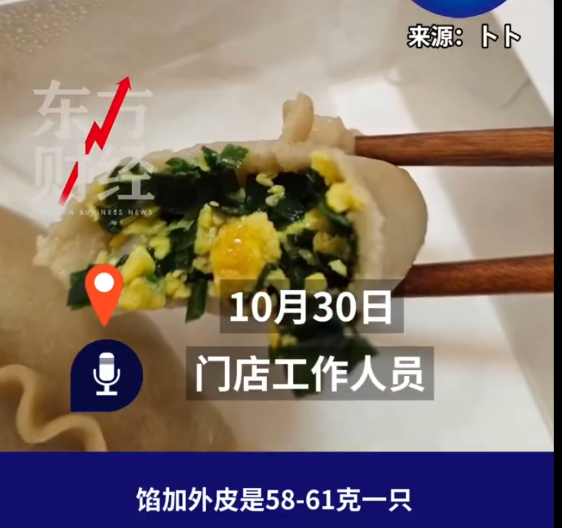该品牌某门店工作人员表示,蒸饺是韭菜鸡蛋虾仁馅,一只蒸饺重58~61克,“每个蒸饺里应该有两到三颗虾仁,最少也有一只虾仁在里面。”对于莜面蒸饺是否太贵,对方表示,“蒸饺的价格一直没改过,因为它成本也在那里,我们用的莜面粉都是有机莜面粉,不是普通的面粉。”