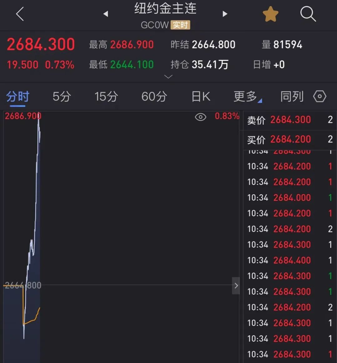 国际金价日内涨近20美元/盎司,最新报2684.3美元/盎司;白银突破31美元/盎司关口,最新报31.06美元/盎司。