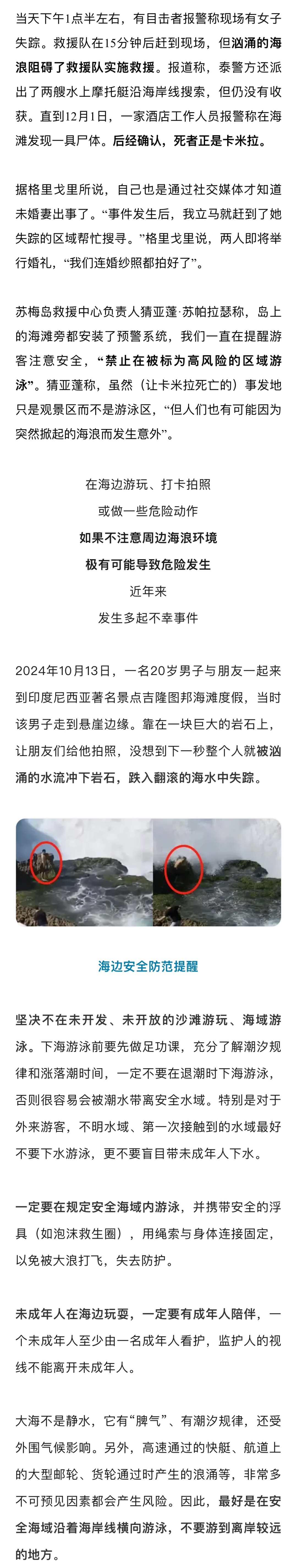 据了解,卡米拉来自俄罗斯新西伯利亚,与未婚夫一起来泰国旅游。上周五(11月29日)事发前,她正独自在海边的岩石上练瑜伽以及拍照。