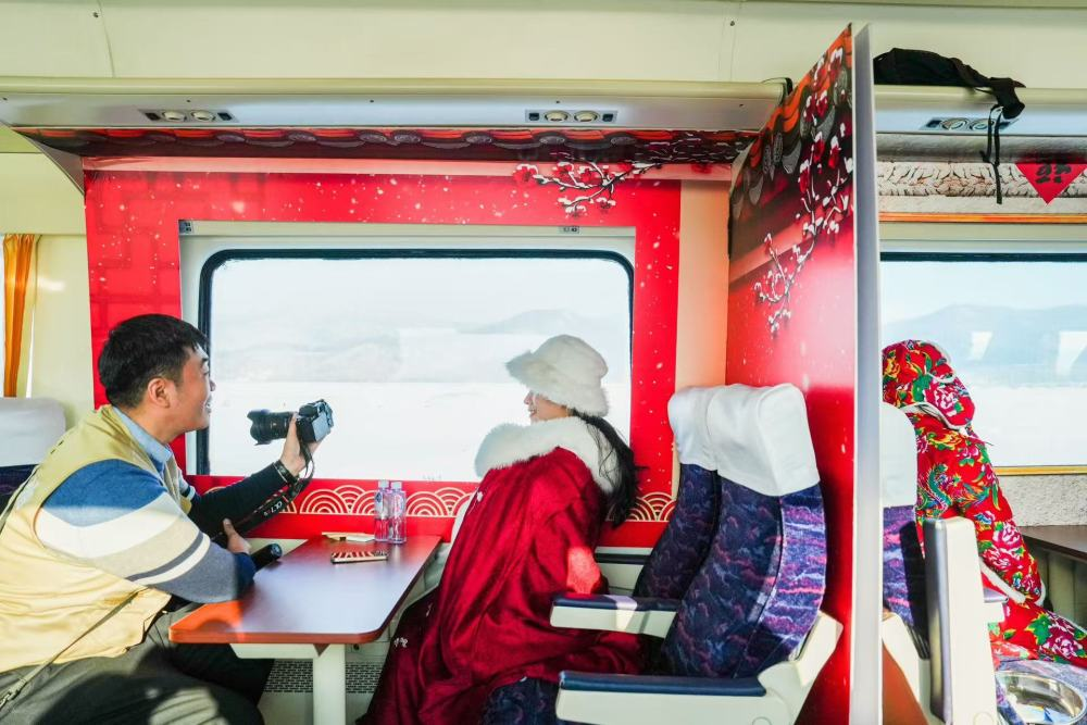 K5197次旅客列车上,游客正在进行旅拍。(中国铁路哈尔滨局集团有限公司供图)