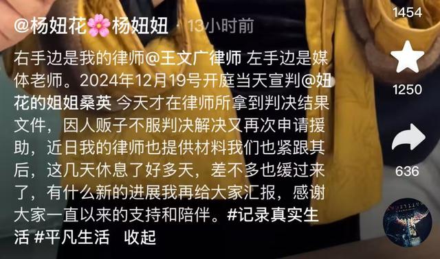 近日,杨妞花发布视频称,已收到余华英拐卖儿童案的判决书,杨妞花提到,贵州高院驳回了余华英“从轻处罚”的请求,认定余华英“系罪行极其严重的犯罪分子”。杨妞花说,“因人贩子不服判决又再次申请法律援助,有什么新的进展我再给大家汇报。”