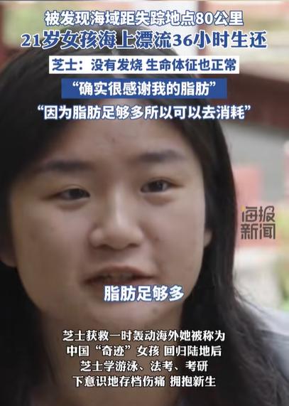 2024年7月8日,在日本伊豆半岛东岸静冈县的一处海滨浴场,21岁的成都女生芝士在近海玩乐时被海水带走。随后36个小时,她依靠租来的救生圈,在海上漂流了约80公里,最终获救生还。近日,该女生再度接受采访称:“确实很感谢我的脂肪,因为它足够多,所以可以消耗,但是就是回来之后还是跟原来的重量一样。”