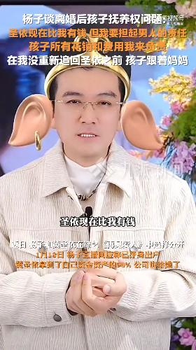 谈及离婚后孩子抚养权问题,杨子表示,“圣依现在比我有钱,但我要担起男人的责任,孩子所有花销和费用我来负责,在我没重新追回圣依之前,孩子跟妈妈。”