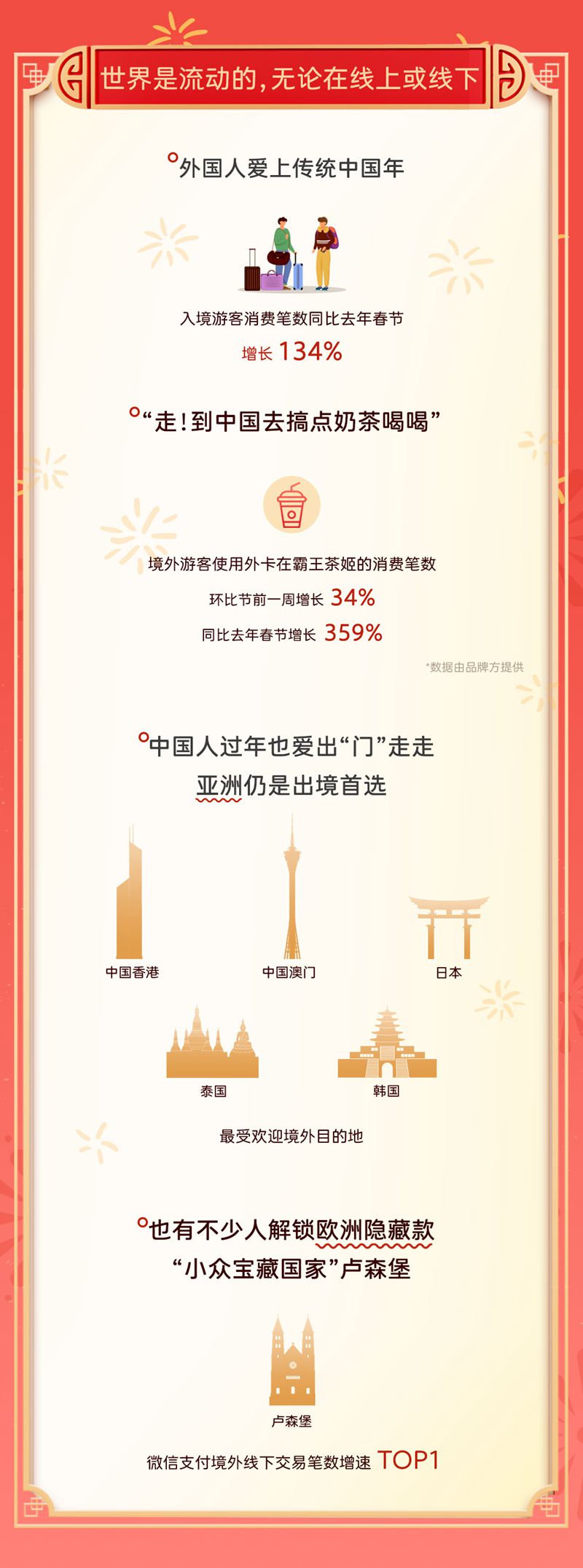 与此同时,春节候鸟迁徙路线早已不是单向的,许多外国人特地赶在春节时分来华,感受中华传统文化和浓郁的年俗氛围。春节期间,入境游客消费笔数同比去年春节增长134%。而小小一杯中式茶饮,就给了外国友人亿点点震撼,境外游客使用外卡在霸王茶姬外卡的消费笔数同比去年春节增长359%。