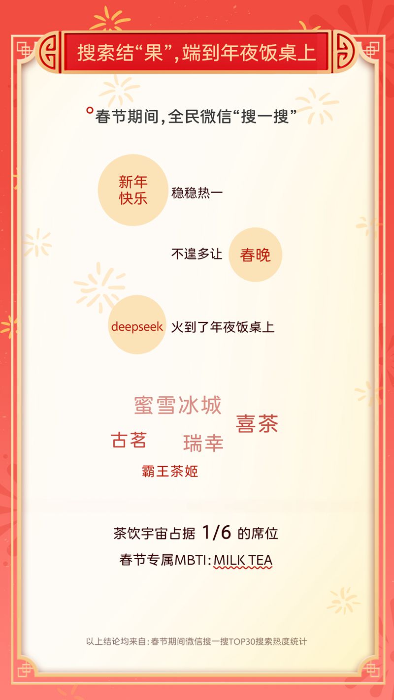 比起出游和充电,麻将配奶茶也许更能代表春节聚会的日常,报告中多处提及“奶茶经济”数据。首先,春节期间微信搜一搜搜索热度,前30位高频搜索词汇中,奶茶品牌占据了1/6的席位:霸王茶姬、古茗、喜茶、瑞幸、蜜雪冰城。香港人春节期间到内地跨年,也热衷探索新茶饮,生椰拿铁、多肉葡萄、伯牙绝弦等饮品深受欢迎。