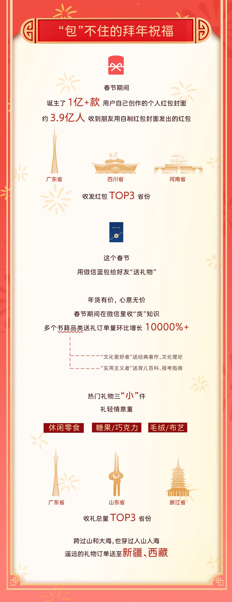 今年,微信蓝包带来春节首秀,在节前接连更新玩法。报告显示,春节期间,在微信里为朋友“送礼物”的需求旺盛。其中,收到礼物数目最多的省份前三甲是广东省、山东省、浙江省。而较远的新疆维吾尔自治区、西藏自治区等地区,也都有人收到蓝包祝福。