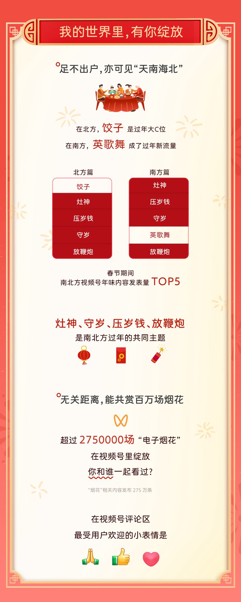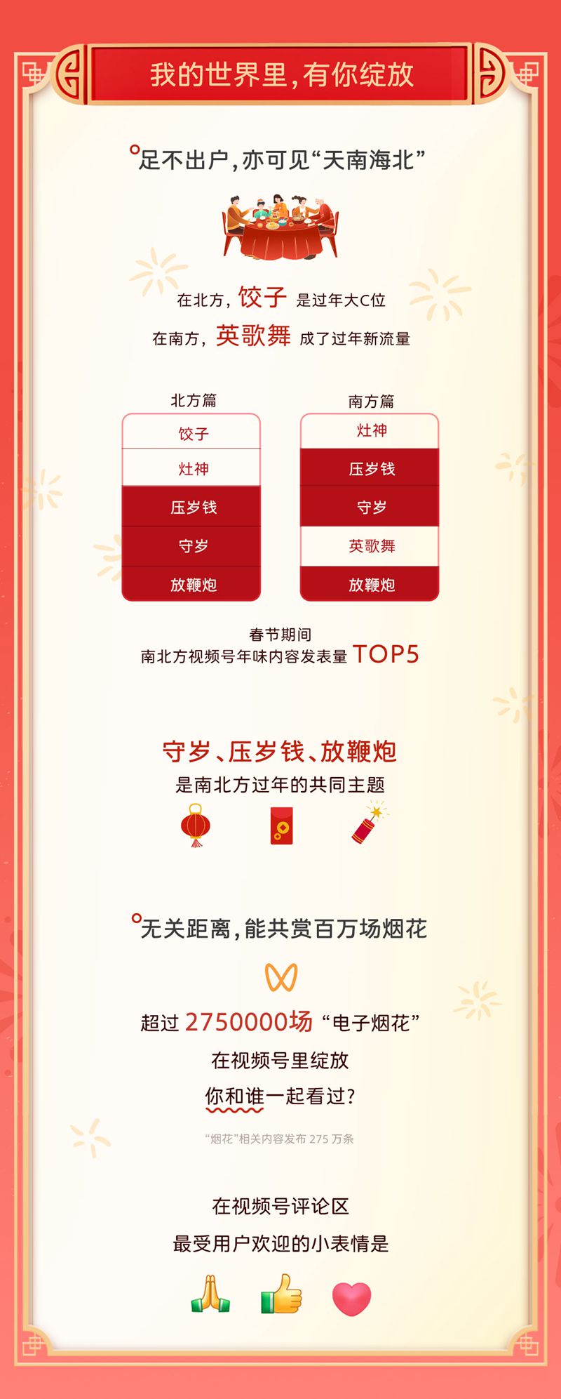 随着短视频记录生活成为日常,年味儿内容也成为创作者们的热门选题。春节期间,视频号里发表了275万条“烟花”相关内容,网友们隔着不同的时空,却能在线共赏同一场电子烟花;而南北方的创作者发布的内容则一定程度上代表了习俗差异,南方创作者的内容中包含更多“英歌舞”元素,对北方创作者来说,“饺子”的江湖地位则不可动摇。但是,无论地区,“压岁钱、守岁、灶神、放鞭炮”都是新春不变的主题,从南火到北。