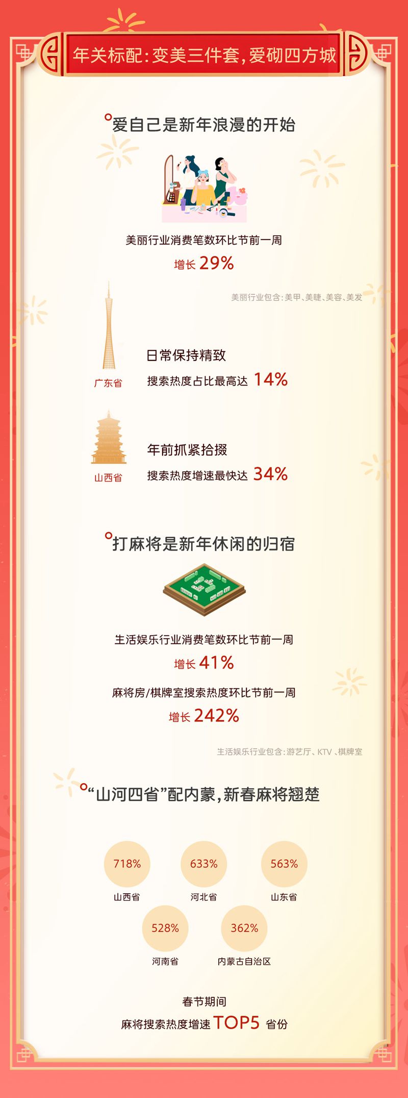 打麻将这门国粹,也是年节绕不开的聚会活动。春节期间,麻将房/棋牌室搜索热度环比节前一周暴增 242%,生活娱乐行业相关微信支付消费笔数,环比节前一周增长41%,“山河四省”麻将搜索热度增速占据前四位。