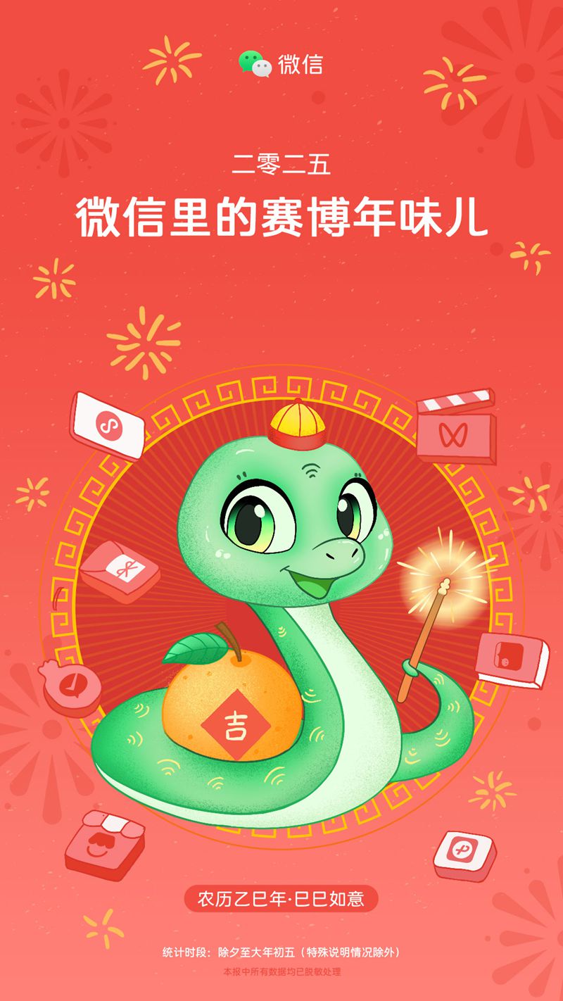 蛇年春节是首个“非遗”春节,假期比以往更长,年味也愈加浓厚。2月5日,微信团队发布2025春节数据报告《微信里的赛博年味儿》,基于除夕至初五的多项数据,为我们展开了一幅年味儿十足的线上画轴。