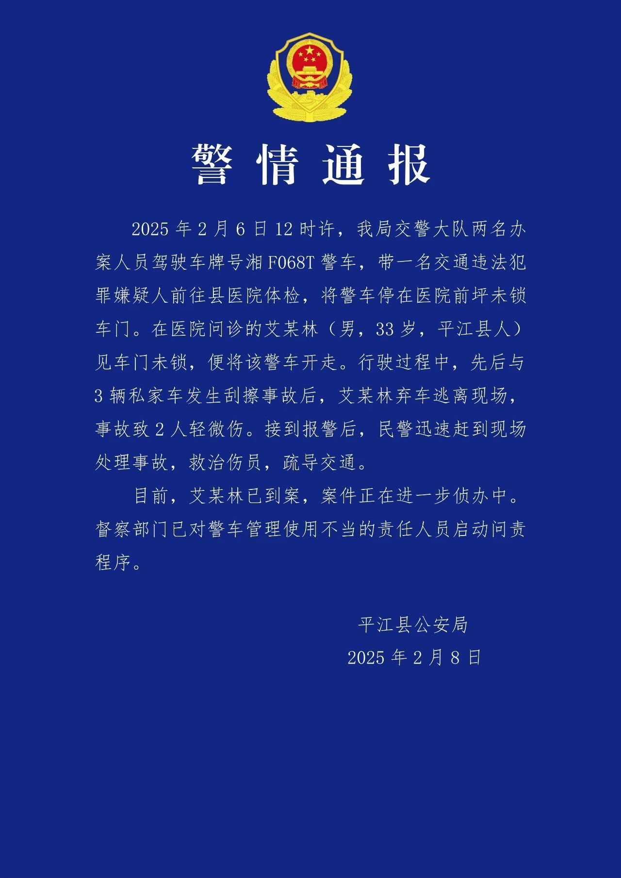 近日,网传湖南一警车连撞3车后驾驶员逃逸。2月8日,平江县公安局发布通报称:2月6日12时许,该局交警大队两名办案人员驾驶车牌号湘F068T警车,带一名交通违法犯罪嫌疑人前往县医院体检,将警车停在医院前坪未锁车门。在医院问诊的艾某林(男,31岁,平江县人)见车门未锁,便将该警车开走。行驶过程中,先后与3辆私家车发生刮擦事故后,艾某林弃车逃离现场,事故致2人轻微伤。接到报警后,民警迅速赶到现场处理事故,救治伤员,疏导交通。