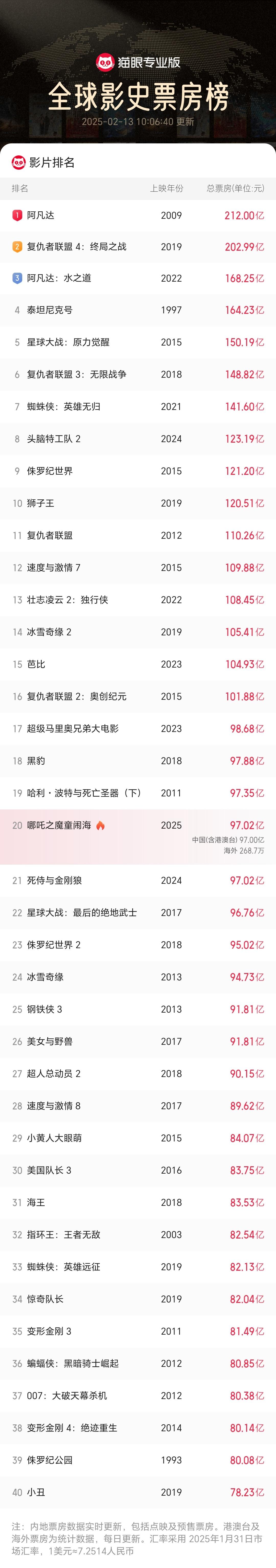 《哪吒2》登顶影史全球单一市场票房榜