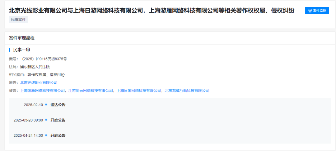 天眼查APP显示,近日,浦东新区人民法院向江苏尚云网络科技有限公司公告送达北京光线影业有限公司诉北京龙威互动科技有限公司、江苏尚云网络科技有限公司、上海游雁网络科技有限公司、上海日游网络科技有限公司著作权权属、侵权纠纷案件起诉状副本、开庭传票等。4月24日,浦东新区人民法院将公开审理此案。