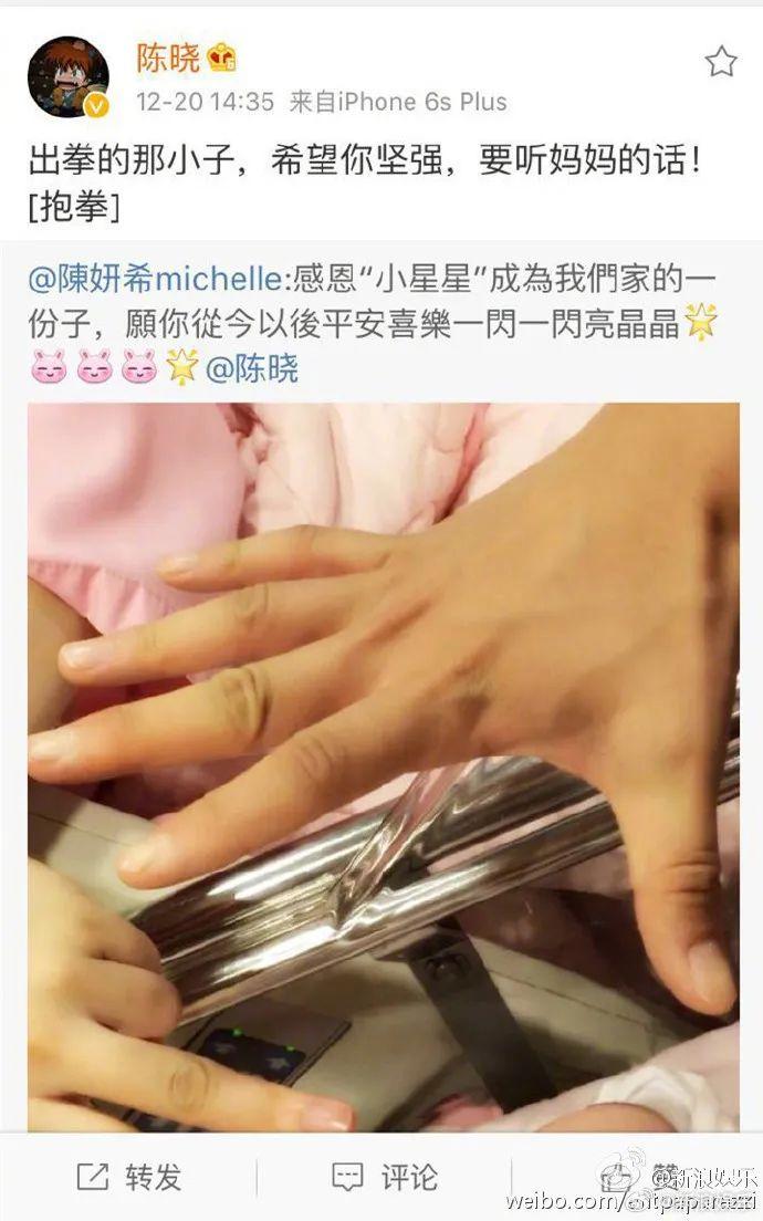 2016年12月20日,陈妍希官宣生子喜讯,“感恩‘小星星’成为我们家的一份子,愿你从今以后平安喜乐一闪一闪亮晶晶。”陈晓转发:“出拳的那小子,希望你坚强,要听妈妈的话。”