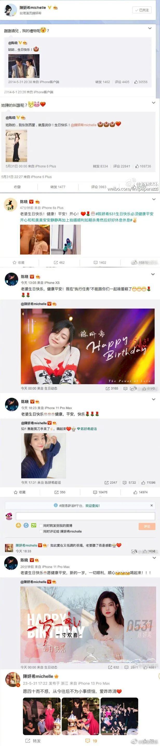 2021年5月31日,陈晓为陈妍希庆生,“老婆生日快乐,健康、平安、快乐。”陈妍希回复:“如此实在又低调的祝福,老婆听了很是感动。”