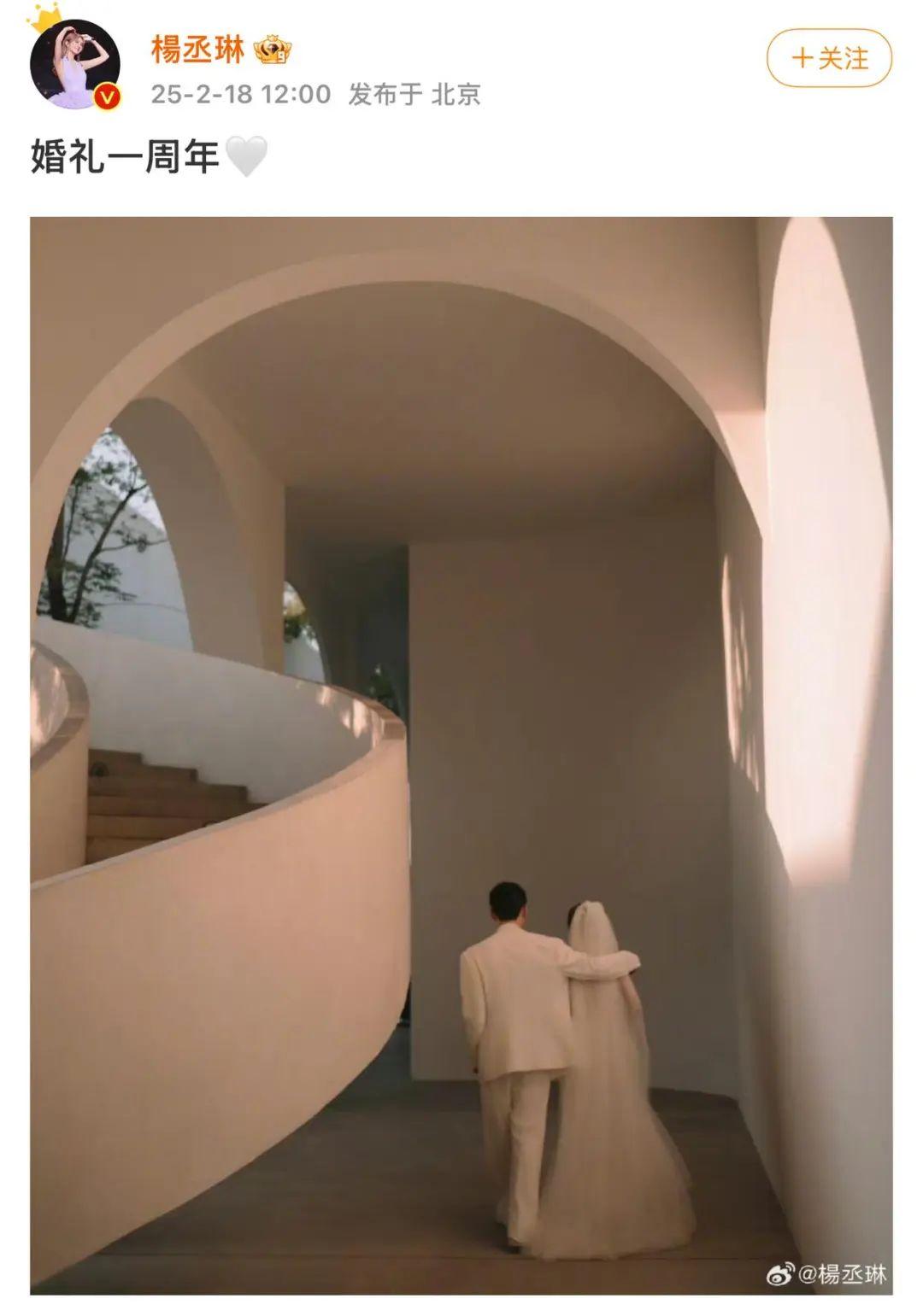 2月18日中午,杨丞琳发文晒出自己和李荣浩的婚纱照,配文:“婚礼一周年。”
