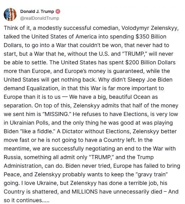 特朗普写道:“想想看,作为一个小有成就的喜剧演员(a modestly successful comedian),泽连斯基竟然说服美国花费3500亿美元,投入一场不可能获胜的战争。”