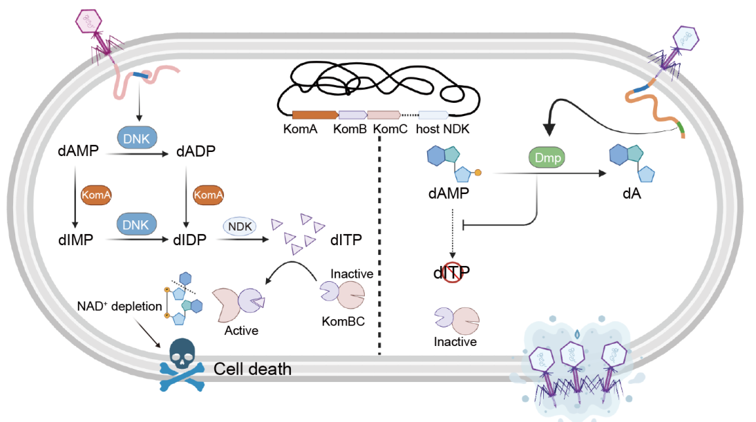 在微观世界里,细菌与病毒之间每天都在上演着攻防大战。生物体内的信号传递如同精密的通信网络,而核苷酸分子长期被认为是关键的“信号兵”。自1950年代发现环状核苷酸(如cAMP、cGMP)以来,科学家已解析了其在代谢调节、免疫应答中的核心作用,相关研究多次获得诺贝尔奖。不同于环状核苷酸的免疫作用,非典型核苷酸在过去普通被认为不发挥任何生理作用。然而,研究团队通过基因分析,锁定了一个由KomA(孔明A)、KomB(孔明B)、KomC(孔明C)三个蛋白组成的防御系统。当噬菌体入侵时,其携带的脱氧核苷酸激酶(DNK)意外成为激活细菌免疫的“开关”:KomA与DNK协作,将核苷酸(dAMP)转化为特殊信号分子dITP。这种分子能触发KomC蛋白分解细胞内的关键物质NAD⁺,导致噬菌体因“能源枯竭”无法复制。令人称奇的是,该系统巧妙利用入侵者携带的酶完成防御,正如三国时期诸葛亮“草船借箭”的智谋,因此被命名为“孔明系统”。这种碱基修饰核苷酸的信号传导模式突破了环状核苷酸作为信号分子的经典理论体系,首次证实非典型核苷酸同样具有免疫调控功能。