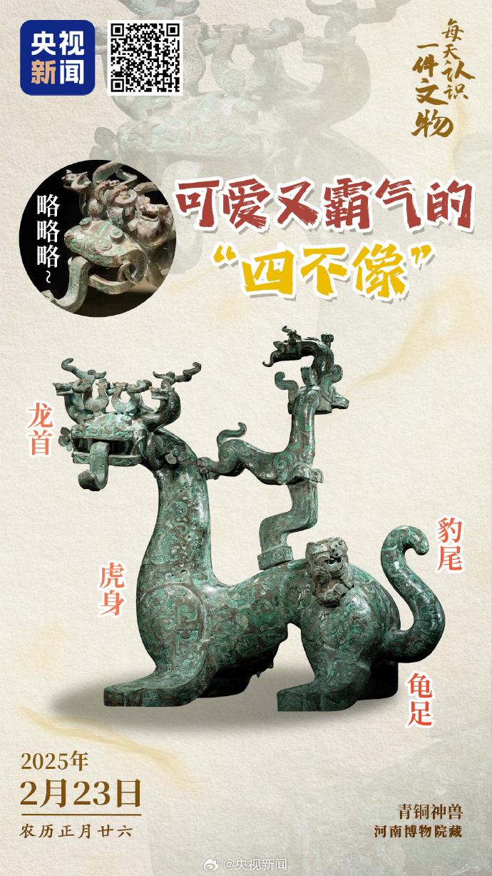 现藏于河南博物院的青铜神兽,龙首虎身龟足豹尾,充满混搭感。龙首怒目圆睁、獠牙交错,看上去神秘威严,但“吐舌”形象又让人忍俊不禁。它由多个部件组成,可进行拆分并自由组装,器身镶嵌有绿松石,龙、凤鸟、云纹、涡纹装饰在不同部位,精致华美令人赞叹。