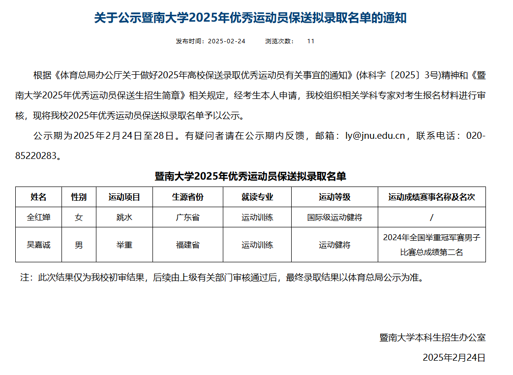 2月24日,暨南大学本科生招生办公室公布了《关于公示暨南大学2025年优秀运动员保送拟录取名单的通知》。