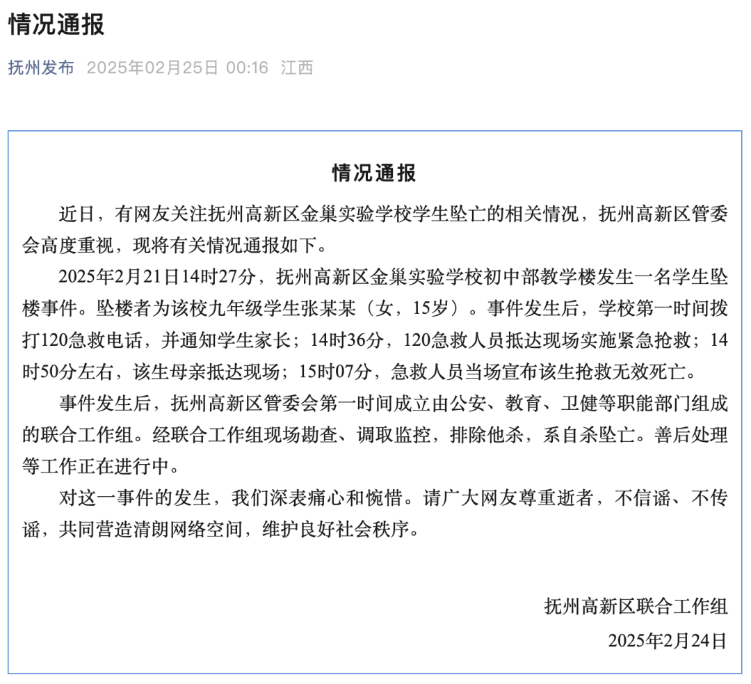 通报称,2025年2月21日14时27分,抚州高新区金巢实验学校初中部教学楼发生一名学生坠楼事件。坠楼者为该校九年级学生张某某(女,15岁)。