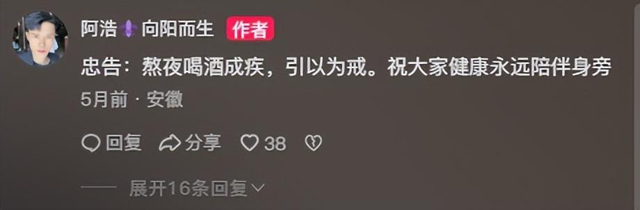 阿浩留下的忠告还挂在他的视频评论区,忠告:熬夜喝酒成疾,引以为戒。祝大家健康永远陪伴身旁。